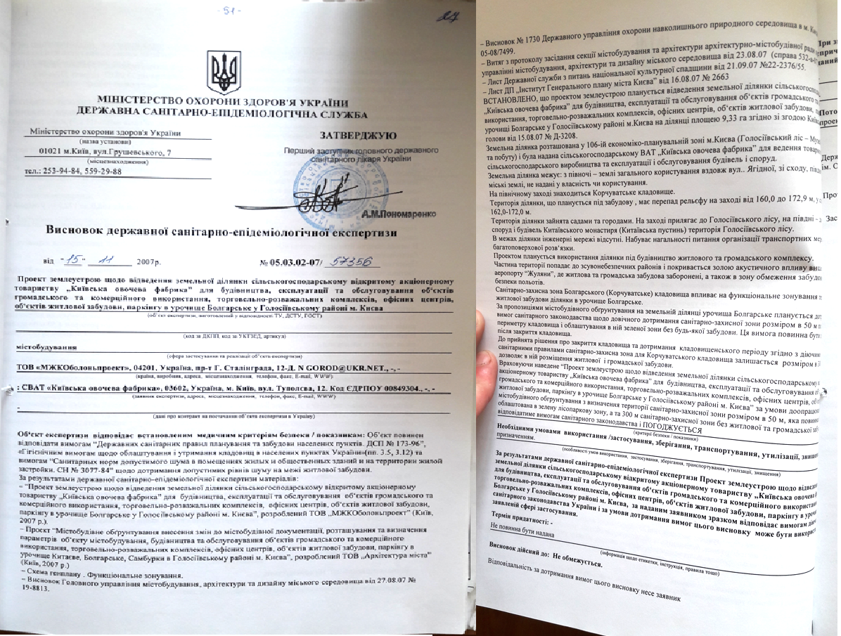 Враховуючи наведене "Проєкт землеустрою щодо відведення земельної ділянки САТ "Київська овочева фабрика" для будівництва, експлуатації та обслуговування обєктів громадського та комерційного використання, торговельно-розважальних комплексів, офісних центрів, обєктів житлової забудови, паркінгу в урочищі Болгарське у Голосіївському районі м. Києва" за умови доопрацювання містобудівного обгрунтування з визначення території санітарно-захисної зони розміром в 50 метрів, яка повинна бути облаштована в зелену лісопаркову зону, а та 300 метрів санітарно-захисної зони без житлової та громадської забудови відповідатиме вимогам санітарного законодавства і ПОГОДЖУЄТЬСЯ".