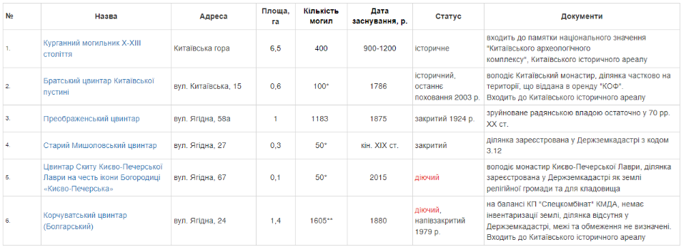 2. | вул. Китаївська, 15 | 0,6 | 100* | 17865 | історичний, останнє поховання 2003 р. | володіє Китаївський монастир, ділянка частково на території, що віддана в оренду "КОФ". Входить до Китаївського історичного ареалу | |