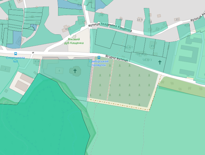 Щоб перевірити чи зафіксовані обмеження у документації щодо земельної ділянки, необхідно переглянути дані Державного земельного кадастру. На жаль, знайти сформовану ділянку на території Корчуватського кладовища неможливо, її просто немає: