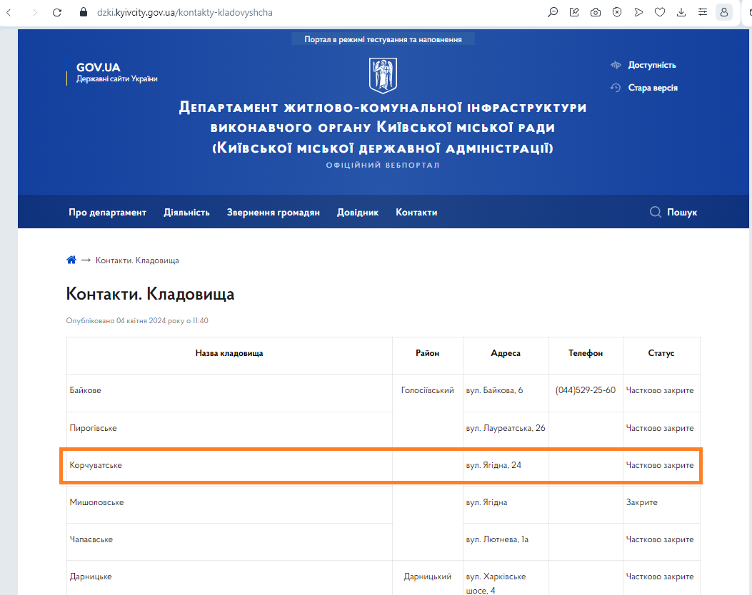 Прикметно, що на сайті профільного Департаменту житлово-комунального господарства КМДА інформація про Корчуватське кладовище подається з адресою вул. Ягідна, 24: